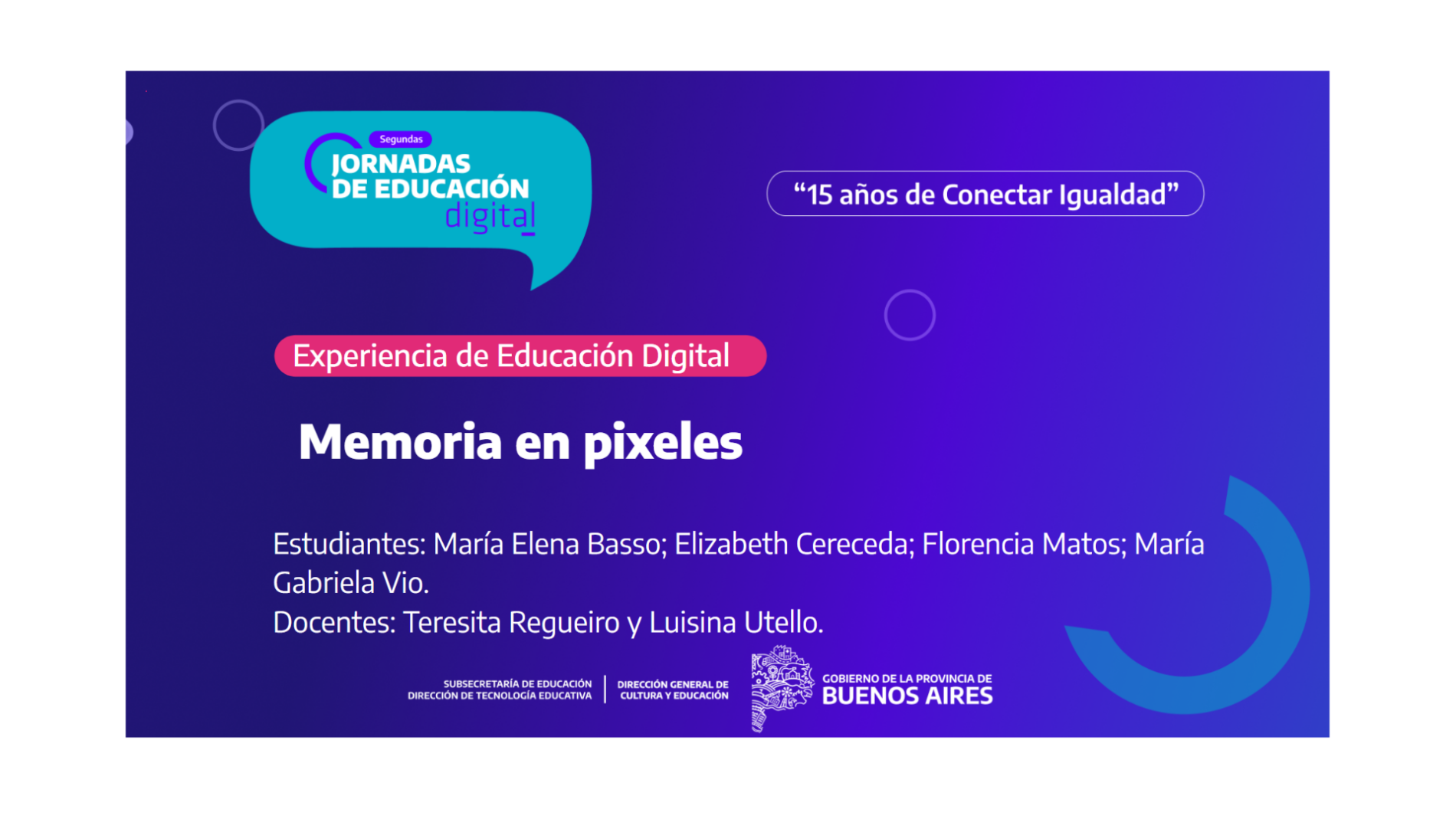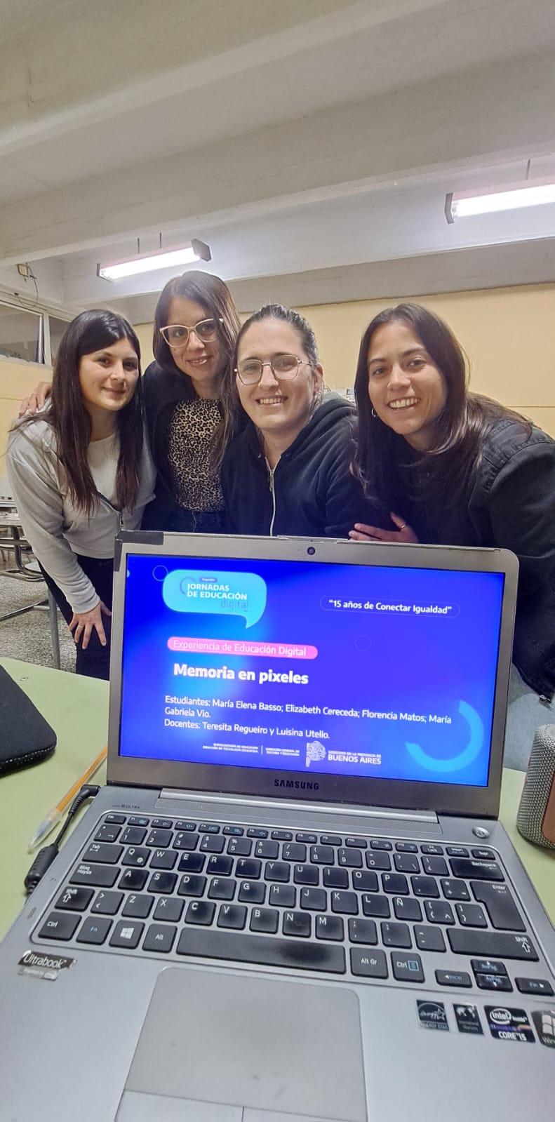 Eli Cereceda, Gabriela Vio, Florencia Matos y María Basso, estudiantes del 3er año del Profesorado de Educación Primaria, participaron como expositoras en las JORNADAS DE EDUCACIÓN DIGITAL organizadas por la Dirección de Tecnología Educativa (@tecnoeducativa_pba) con el proyecto MEMORIA EN PIXELES, acompañadas de las profesoras Luisina Utello y Teresita Regueiro.